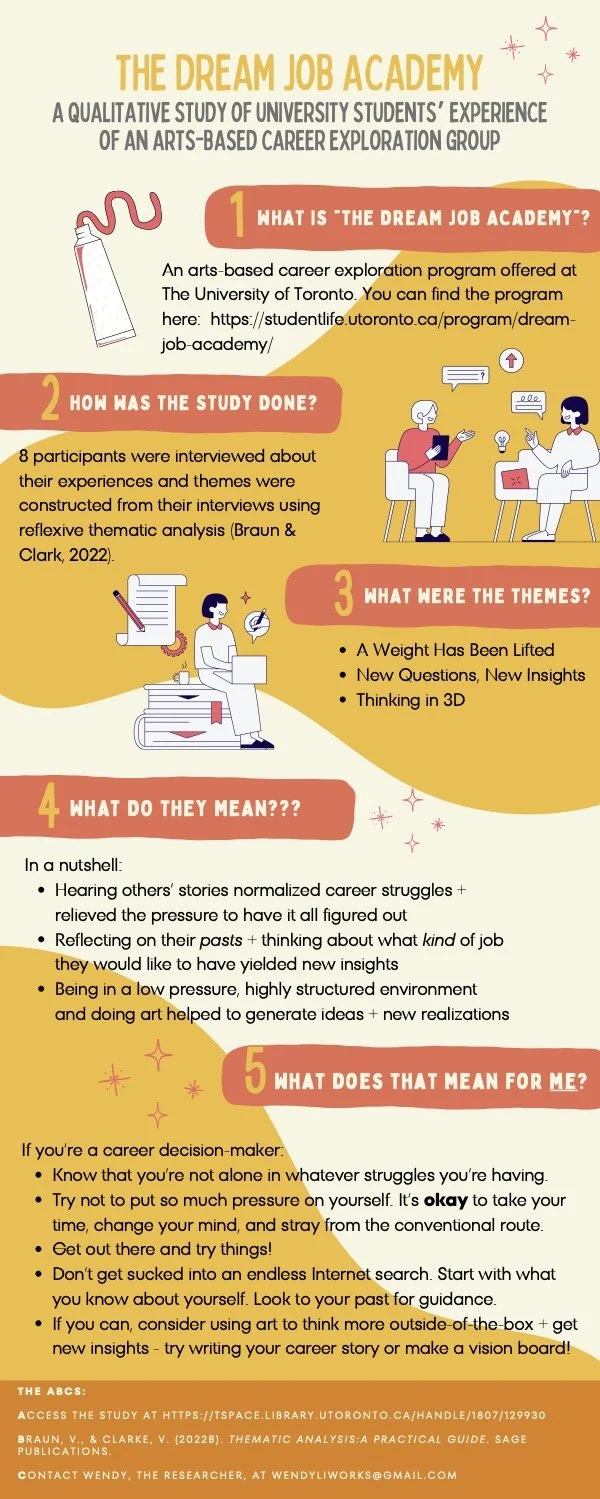 the tl;dr is that I interviewed participants of an arts-based (mostly writing and visual art) career exploration group to explore how using art can help with career development; I was inspired to do this based on my own powerful experience in the group as a participant